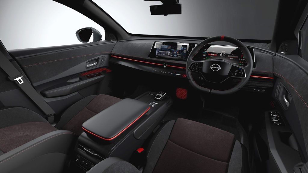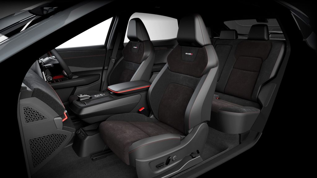 تتميز الداخلية باللون الأسود مع لمسات حمراء مميزة ومقاعد خاصة من نيسمو. عند تفعيل وضع NISMO في السيارات المزودة بنظام صوت BOSE الراقي الحصري من نيسمو، يتولد صوت يذكر بسباقات الفورمولا E.