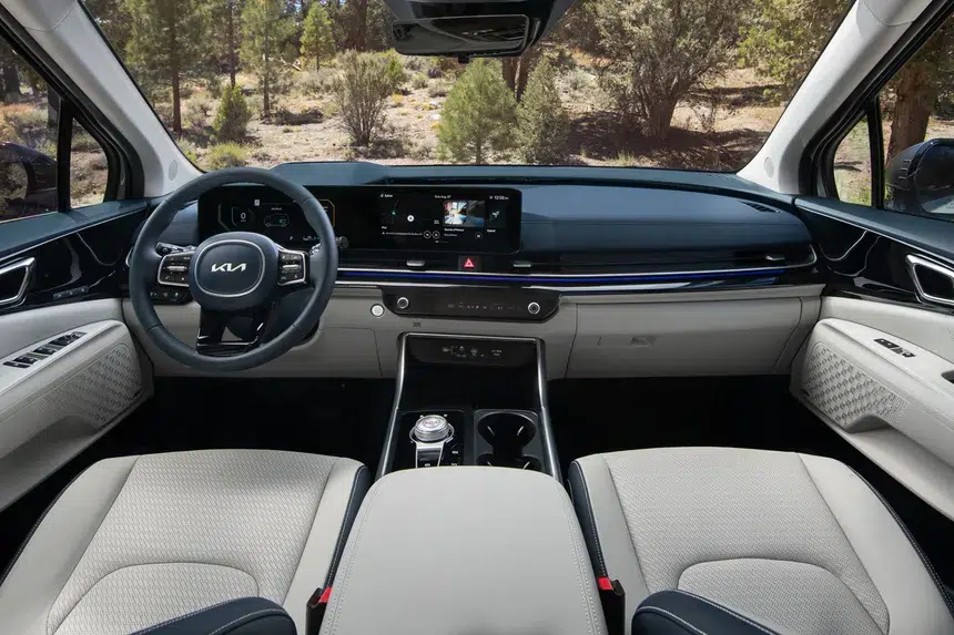 عند الدخول إلى الداخل، تتميز كيا كرنفال 2025 بشاشة بانورامية منحنية، الطرازات العالية تحتوي على زوج من الشاشات بقياس 12.3 بوصة والتي تعمل كلوحة عدادات السيارة ونظام المعلومات والترفيه باللمس، كما يوجد أيضًا محدد تروس بأسلوب دوار جديد، مقاعد كابتن في الصف الثاني، فتحة سقف كهربائية، نظام صوتي Bose بـ12 مكبر صوت، نظام تحكم في المناخ بثلاث مناطق، نظام مراقبة محيط السيارة، لوحة شحن لاسلكية، وإضاءة LED محيطية.