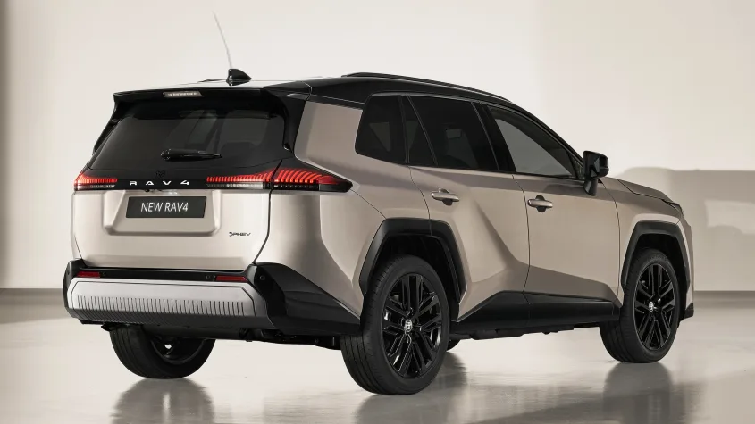 الخطوط الخارجية أصبحت أكثر صلابة وطابعًا “مربّعًا” يعزز حضورها كسيارة SUV قوية، مع أقواس عجلات بلاستيكية تعكس روح الطرق الوعرة. في الخلف، يظهر شعار RAV4 الجديد بين المصابيح المدمجة في شريط أسود عريض.